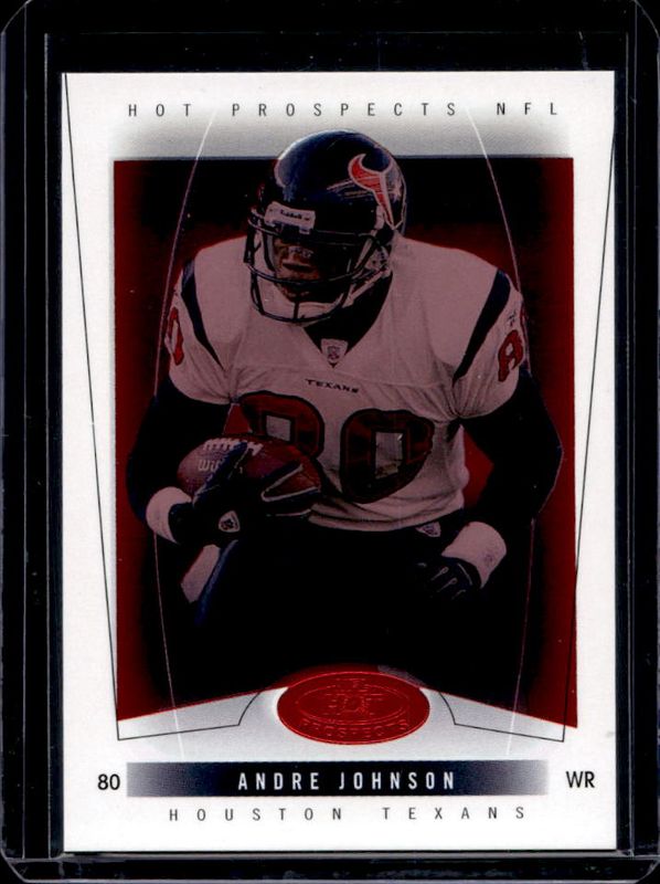 The Andre Johnson 2004 Fleer Hot Prospects #9 Red Hot /50 card is 1 of 10 Andre Johnson's card variations in the 2004 Fleer Hot Prospects set being tracked by Sports Card Investor, including Base /350, White Hot /1, Draft Rewind, Draft Rewind Jersey /154, and Draft Rewind Jersey Patches /64.