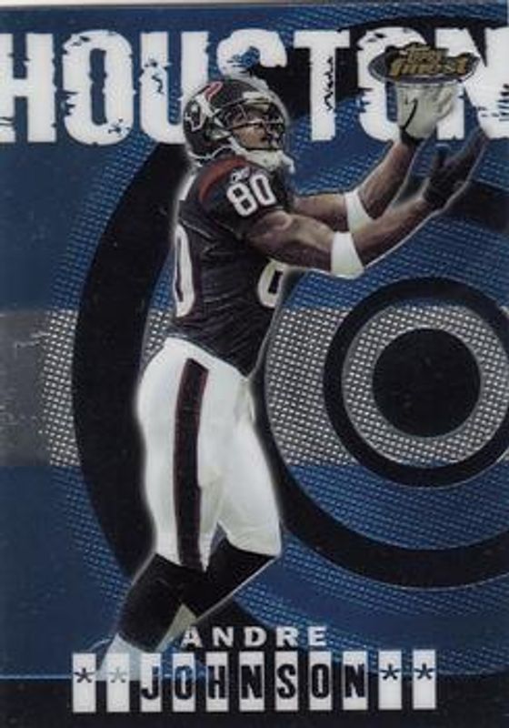 The Andre Johnson 2004 Topps Finest #52 Base /399 card is 1 of 9 Andre Johnson's card variations in the 2004 Topps Finest set being tracked by Sports Card Investor, including Refractors /199, Uncirculated Gold X-Fractors /150, Gold Refractor /50, X-Fractor /5, and Printing Plate Black /1.