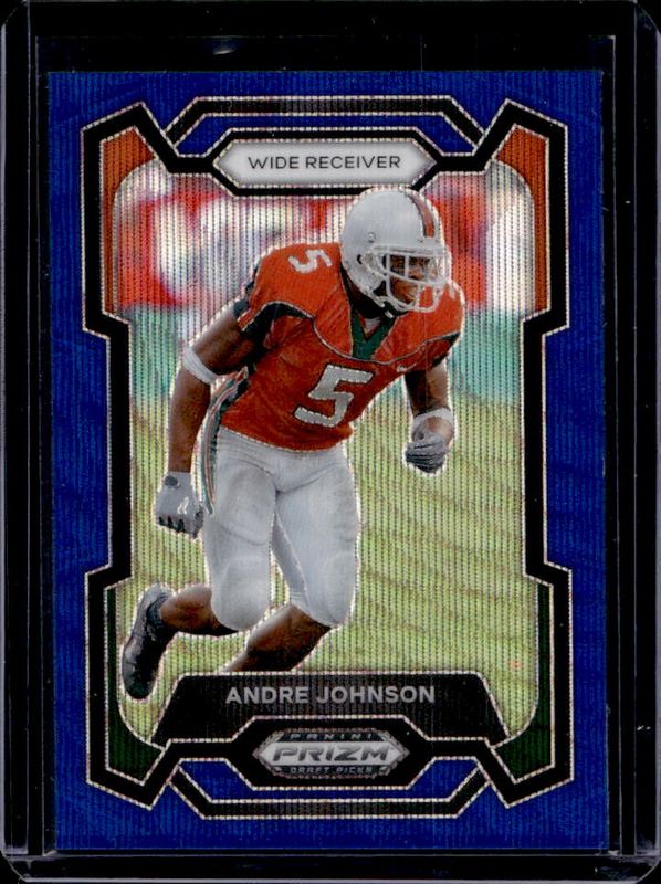 The Andre Johnson 2024 Prizm Draft Picks #52 Blue Wave /249 card is 1 of 29 Andre Johnson's card variations in the 2024 Prizm Draft Picks set being tracked by Sports Card Investor, including Base, Green, Purple Wave, Red Ice, and Ruby Wave.