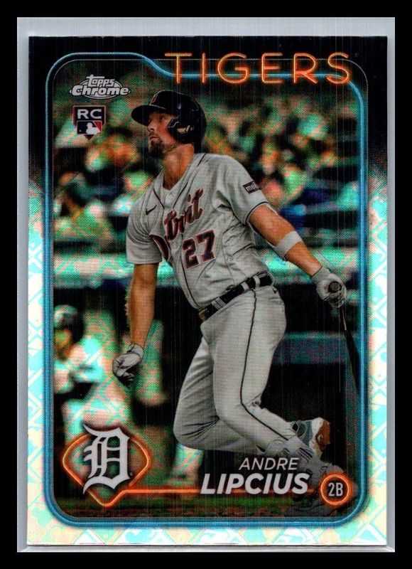 The Andre Lipcius 2024 Topps Chrome Logofractor Edition #227 Base Rookie card is 1 of 10 Andre Lipcius' card variations in the 2024 Topps Chrome Logofractor Edition set being tracked by Sports Card Investor, including Purple /250, Aqua /199, Blue /150, Green /99, and Gold /50.