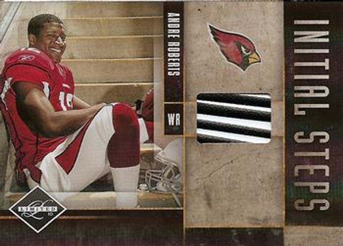 The Andre Roberts 2010 Limited #33 Initial Steps Shoes /80 Rookie card is 1 of 18 Andre Roberts' card variations in the 2010 Limited set being tracked by Sports Card Investor, including Base /199, Gold Spotlight /25, Silver Spotlight /25, Platinum Spotlight /1, and Rookie Jumbo Jerseys /100.