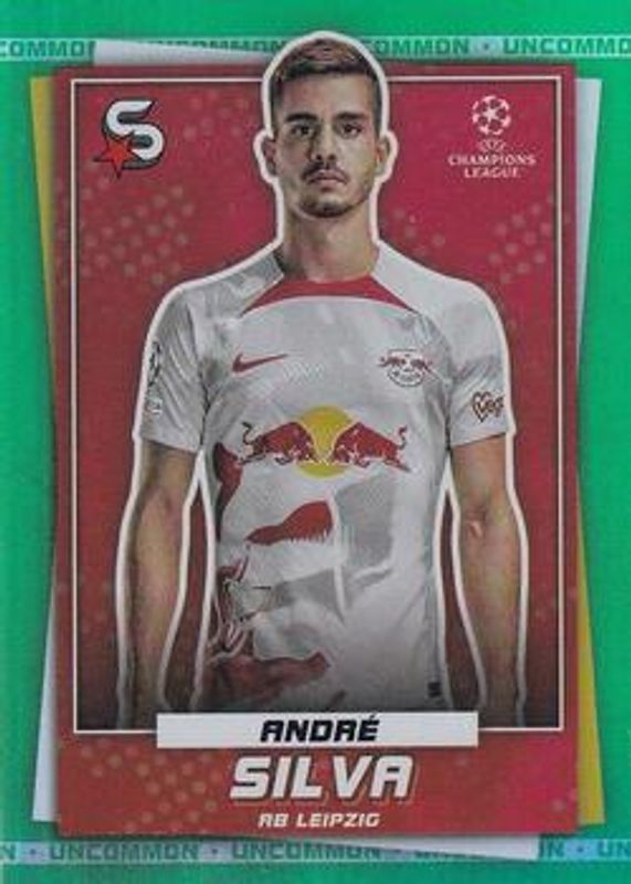 The Andre Silva 2022 Topps UEFA Superstars #122 Uncommon Green card is 1 of 16 Andre Silva's card variations in the 2022 Topps UEFA Superstars set being tracked by Sports Card Investor, including #122 Base, #122 Common Yellow, #122b Common Yellow, #122 Fire & Ice Limited, and #122 Molten Rare.