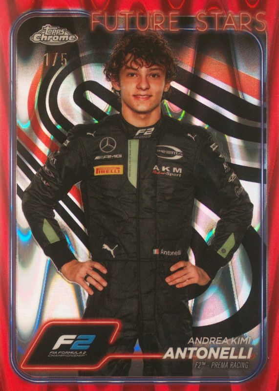 This card is 1 of 35 Andrea Kimi Antonelli's card variations in the 2024 Topps Chrome Formula 1 set being tracked by Sports Card Investor, including Base, Black & White RayWave Refractor, Checker Flag Refractor, Gold & Purple Refractor, and Orange & Red Refractor.