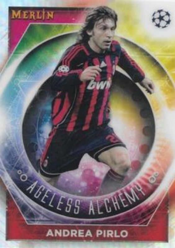 The Andrea Pirlo 2022 Topps Merlin Chrome UEFA Club Competitions #AA-17 Ageless Alchemy card is 1 of 6 Andrea Pirlo's card variations in the 2022 Topps Merlin Chrome UEFA Club Competitions set being tracked by Sports Card Investor, including Ageless Alchemy - Blue Refractor /75, Ageless Alchemy - Gold Refractor /50, Ageless Alchemy - Orange Refractor /25, Ageless Alchemy - Red Refractor /10, and Ageless Alchemy - SuperFractor /1.