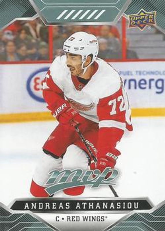 The Andreas Athanasiou 2019 Upper Deck MVP #168 Base card is 1 of 12 Andreas Athanasiou's card variations in the 2019 Upper Deck MVP set being tracked by Sports Card Investor, including Blue, Gold Script, Puzzle Backs, Silver Script, and Super Script /25.