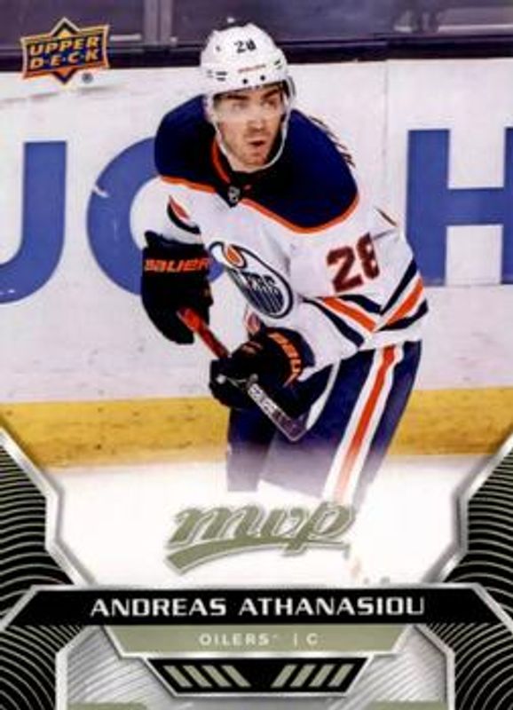 The Andreas Athanasiou 2020 Upper Deck MVP #162 Base card is 1 of 19 Andreas Athanasiou's card variations in the 2020 Upper Deck MVP set being tracked by Sports Card Investor, including Blue, Gold Script, Puzzle Backs, Silver Script, and Super Script /25.