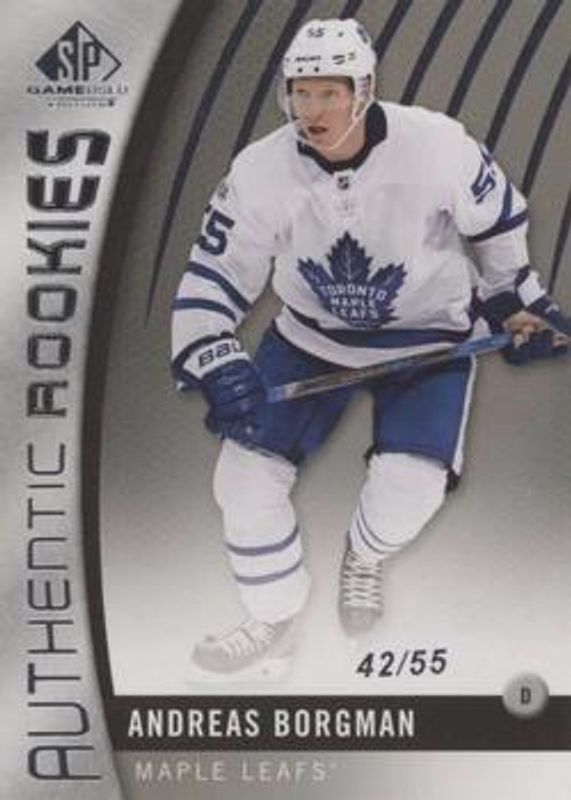 The Andreas Borgman 2017 SP Game Used #118 Base /73 Rookie card is 1 of 4 Andreas Borgman's card variations in the 2017 SP Game Used set being tracked by Sports Card Investor, including Authentic Rookies Rainbow /218, Orange Rainbow /113, and Green Storm /1.