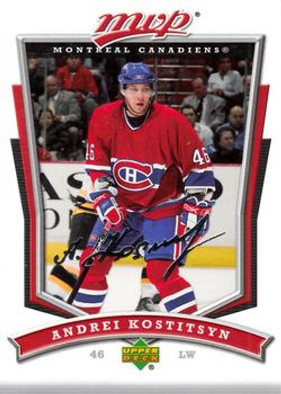 The Andrei Kostitsyn 2007 Upper Deck MVP #61 Base card is 1 of 3 Andrei Kostitsyn's card variations in the 2007 Upper Deck MVP set being tracked by Sports Card Investor, including Gold Scripts /100, and Super Scripts /25.