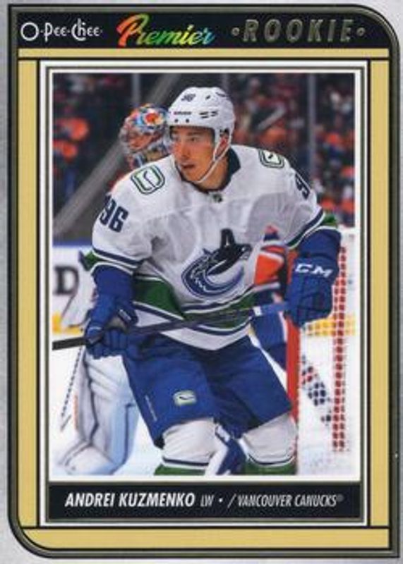 The Andrei Kuzmenko 2022 O-Pee-Chee #P-100 O-Pee-Chee - Premier Rookie card is 1 of 24 Andrei Kuzmenko's card variations in the 2022 O-Pee-Chee set being tracked by Sports Card Investor, including Base, Blue Border, Red Border, Retro, and Retro Blank Back.