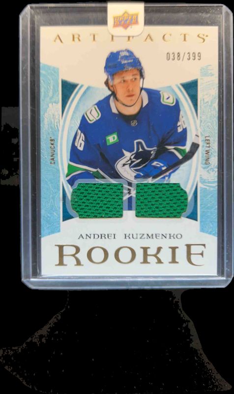 The Andrei Kuzmenko 2022 Upper Deck Artifacts #IV Roman Numeral Rookies Material - Gold /399 card is 1 of 10 Andrei Kuzmenko's card variations in the 2022 Upper Deck Artifacts set being tracked by Sports Card Investor, including Base /999, Roman Numeral Rookies - Material Emerald /99, Rookie Redemptions - Emerald /99, Roman Numeral Rookies Material - Purple /49, and Roman Numeral Rookies Auto Material - Gold /35.