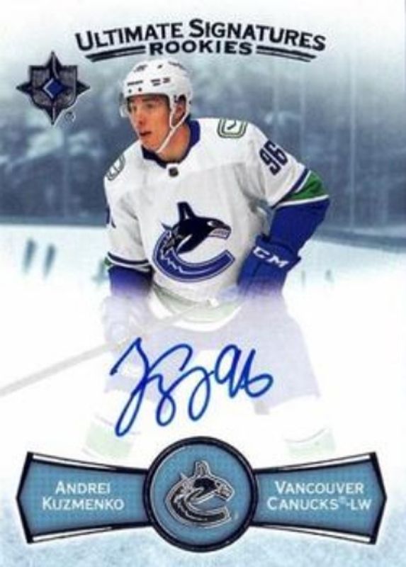 The Andrei Kuzmenko 2022 Upper Deck Ultimate Collection #USR-AK Ultimate Signatures Rookies card is 1 of 34 Andrei Kuzmenko's card variations in the 2022 Upper Deck Ultimate Collection set being tracked by Sports Card Investor, including Base /299, Ultimate Rookies Jersey /799, Ultimate Rookies Patch Auto /99, Jumbo Patch Auto /3, and Shield Patch Auto /1.