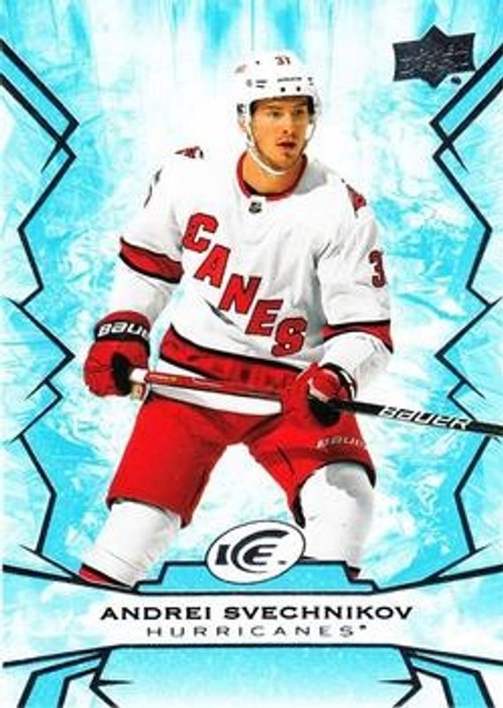 The Andrei Svechnikov 2022 Upper Deck Ice #57 Base /1299 card is 1 of 15 Andrei Svechnikov's card variations in the 2022 Upper Deck Ice set being tracked by Sports Card Investor, including Autographs White Snowflake, Gold, Green, Ice Blue, and Jersey.