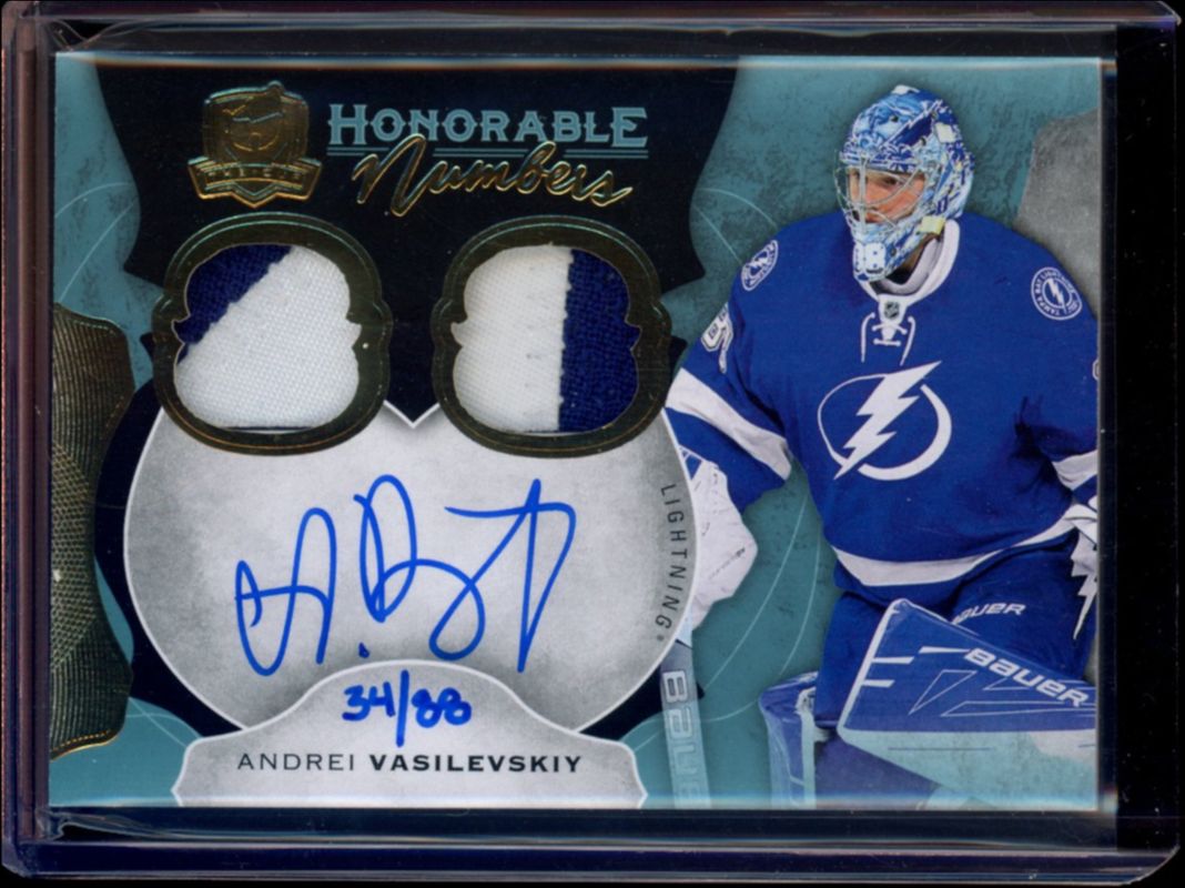 The Andrei Vasilevskiy 2016 Upper Deck The Cup #HN-AV Honorable Numbers /34 card is 1 of 12 Andrei Vasilevskiy's card variations in the 2016 Upper Deck The Cup set being tracked by Sports Card Investor, including Brilliance Autographs, Signatures Materials /99, Scripted Materials /35, Cup Foundations /25, and Cup Foundation Quad Jersey Auto /15.