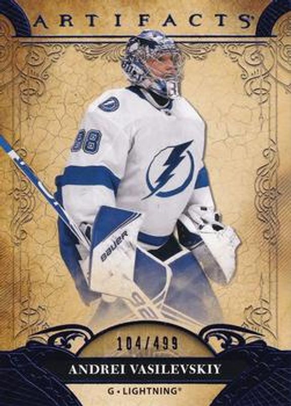 The Andrei Vasilevskiy 2020 Upper Deck Artifacts #61 Blue Sapphire /499 card is 1 of 18 Andrei Vasilevskiy's card variations in the 2020 Upper Deck Artifacts set being tracked by Sports Card Investor, including Base /999, Copper /299, Emerald /99, Autumn /75, and Aqua /45.