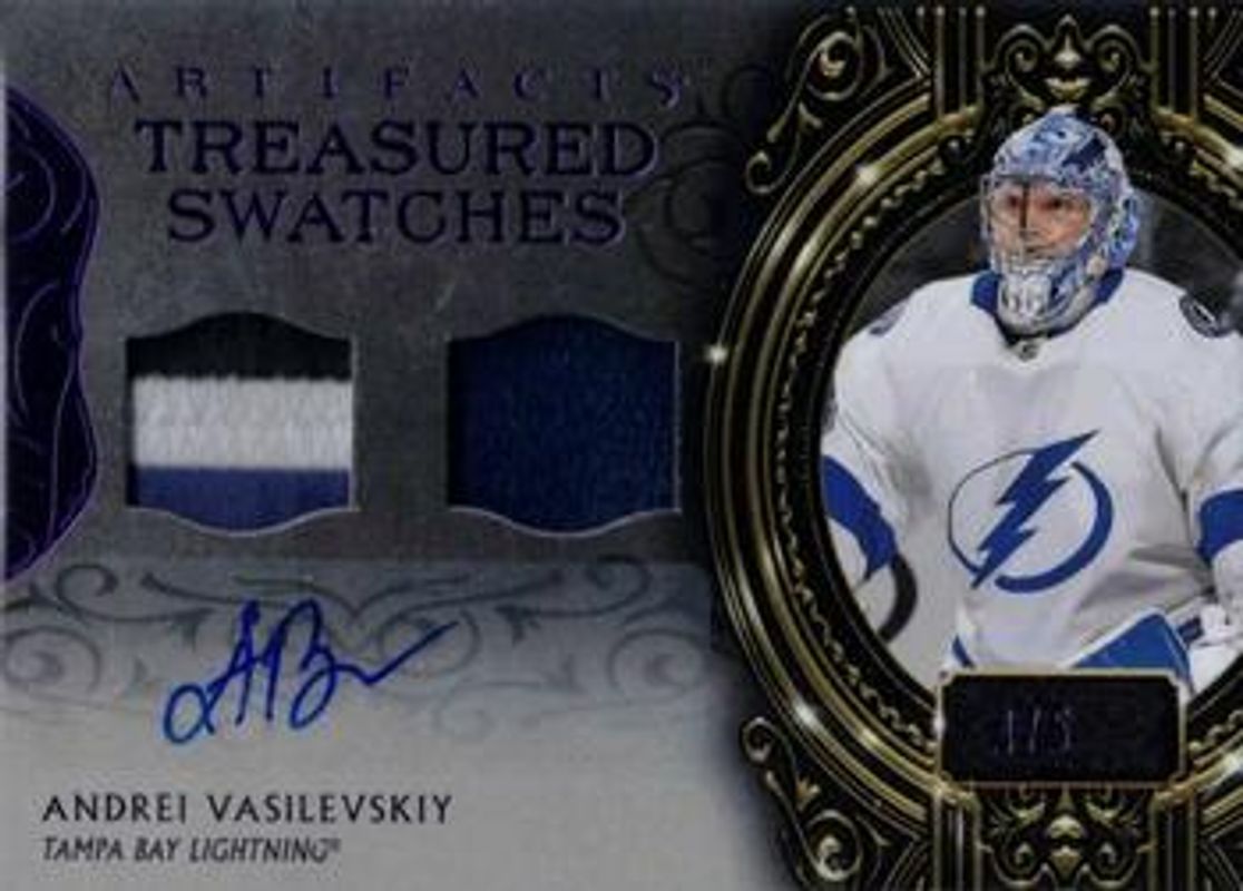 The Andrei Vasilevskiy 2020 Upper Deck Artifacts #TS-AV Treasured Swatches Autographs Premium /5 card is 1 of 18 Andrei Vasilevskiy's card variations in the 2020 Upper Deck Artifacts set being tracked by Sports Card Investor, including Base /999, Blue Sapphire /499, Copper /299, Emerald /99, and Autumn /75.