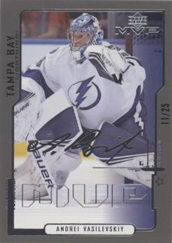 The Andrei Vasilevskiy 2020 Upper Deck MVP #79 20th Anniversary First Star /25 card is 1 of 19 Andrei Vasilevskiy's card variations in the 2020 Upper Deck MVP set being tracked by Sports Card Investor, including Base, Blue, Gold Script, Puzzle Backs, and Silver Script.