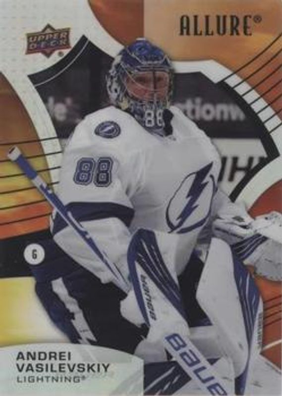 The Andrei Vasilevskiy 2021 Upper Deck Allure #86 Sunrise card is 1 of 43 Andrei Vasilevskiy's card variations in the 2021 Upper Deck Allure set being tracked by Sports Card Investor, including Base, Black Rainbow, Blue China, Orange Slice die-cut, and Pink Blue Leopard.