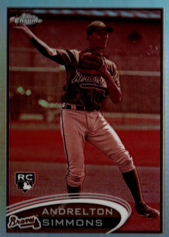 This card is 1 of 12 Andrelton Simmons' card variations in the 2012 Topps Chrome set being tracked by Sports Card Investor, including Base, Orange Refractor, Purple Refractor, Refractor, and X-Fractor.