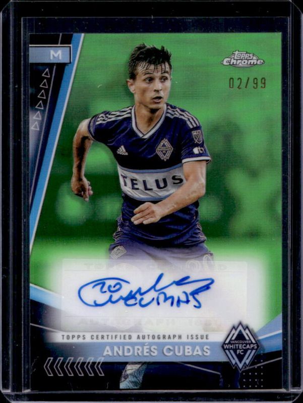 The Andres Cubas 2024 Topps Chrome MLS #CA-AC Chrome Autographs - Neon Green Refractor /99 card is 1 of 33 Andres Cubas' card variations in the 2024 Topps Chrome MLS set being tracked by Sports Card Investor, including Base, Aqua Lava Refractor, Gold Lava Refractor, Neon Green Lava Refractor, and Prism Refractor.