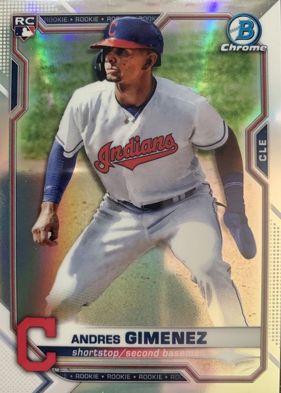 This card is 1 of 13 Andres Gimenez's card variations in the 2021 Bowman Chrome set being tracked by Sports Card Investor, including Base, Refractor /499, Pink Refractor /299, Purple Refractor /250, and Fuchsia Refractor /199.