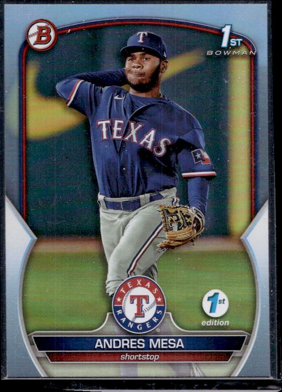 The Andres Mesa 2023 Bowman 1st Edition #BPPF-44 Sky Blue Foil card is 1 of 9 Andres Mesa's card variations in the 2023 Bowman 1st Edition set being tracked by Sports Card Investor, including Base, Blue Foil /150, Yellow Foil /75, Gold Foil /50, and Orange Foil /25.