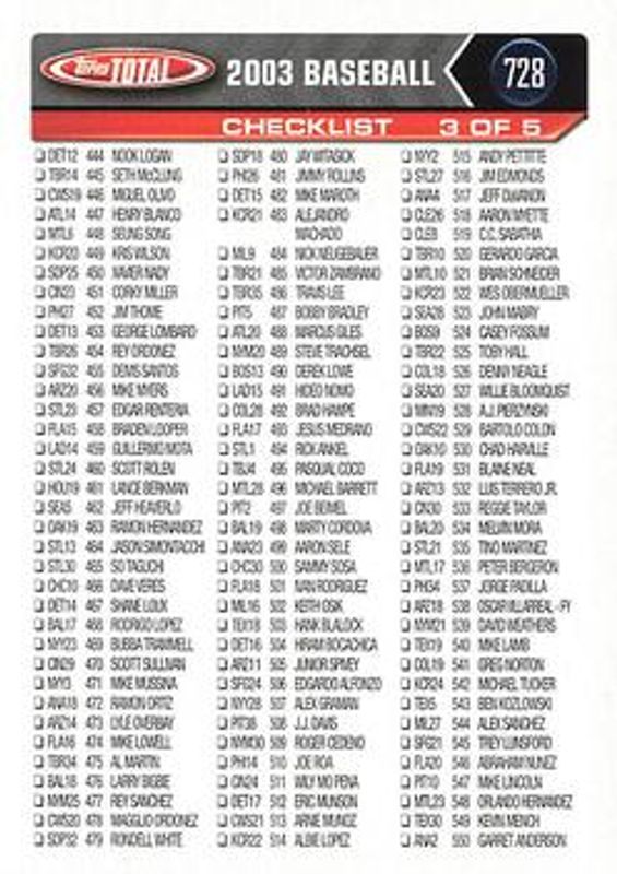 Other popular players in the 2003 Topps Total set include Robin Ventura, Hideo Nomo, Chase Utley, Francisco Rodriguez, and Victor Martinez.