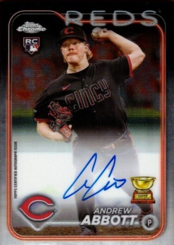 The Andrew Abbott 2024 Topps Chrome #RA-AA Rookie Autographs card in Raw condition has moved up $1.00 (+11.1%) in the last 30 days and was last sold for $10.00 .