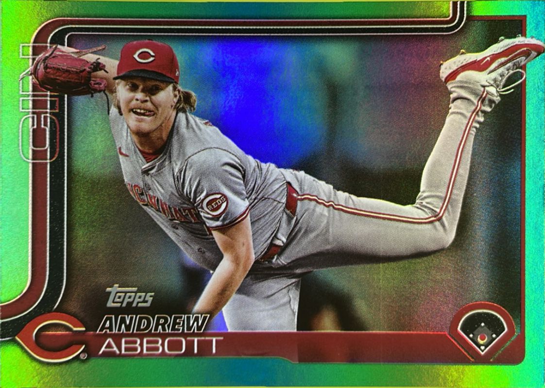 The Andrew Abbott 2025 Topps #140 Green Rainbow /99 card is 1 of 76 Andrew Abbott's card variations in the 2025 Topps set being tracked by Sports Card Investor, including Base, Aqua Holo Foil, Diamante Foil, Holo Foil, and Pink Diamante Foil.