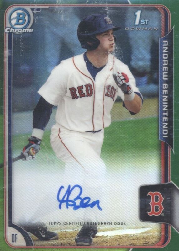 The Andrew Benintendi 2015 Bowman Draft #BCA-AB Chrome DP Auto - Green Refractor /99 (1st) card in Raw condition has not changed in price in the last 30 days and was last sold for $26.16 .