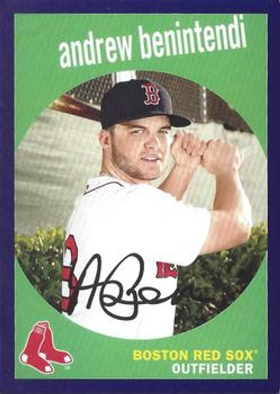 The Andrew Benintendi 2018 Topps Archives #14 Purple /175 card is 1 of 9 Andrew Benintendi's card variations in the 2018 Topps Archives set being tracked by Sports Card Investor, including Base, 1959 & 1977 Signatures Omissions, 1959 Venezuelan, Silver /99, and Blue /25.