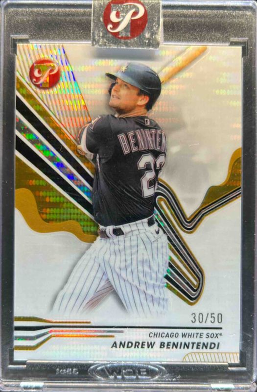 The Andrew Benintendi 2024 Topps Pristine #29 Pristine Gold Refractor /50 card is 1 of 18 Andrew Benintendi's card variations in the 2024 Topps Pristine set being tracked by Sports Card Investor, including Base, Pristine Refractor, Refractor, Green Refractor /150, and Pristine Purple Refractor /99.