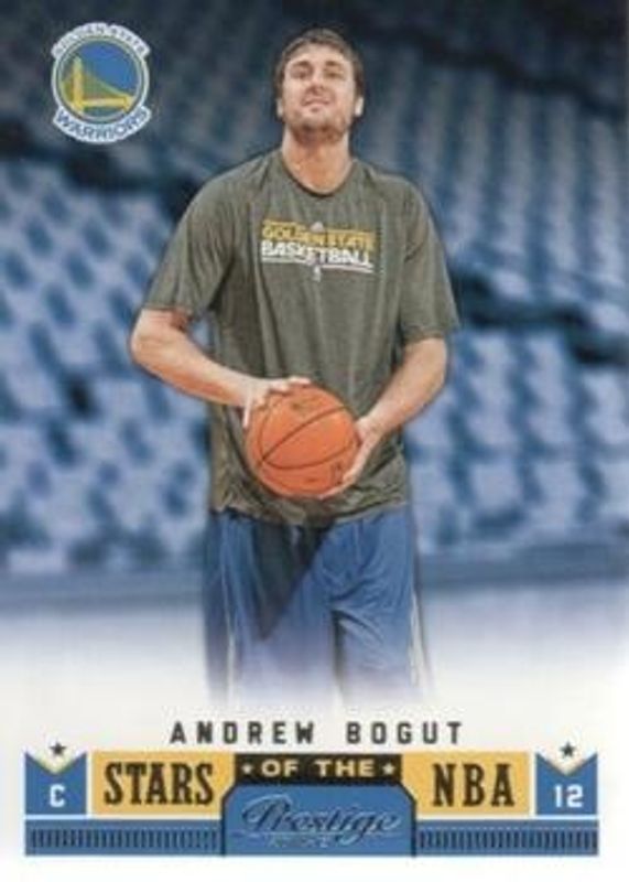 The Andrew Bogut 2012 Prestige #20 Stars of the NBA card is 1 of 6 Andrew Bogut's card variations in the 2012 Prestige set being tracked by Sports Card Investor, including Base, Bonus Shots Gold /249, Bonus Shots Black /10, Distinctive Ink, and Stars of the NBA Black Friday /5.