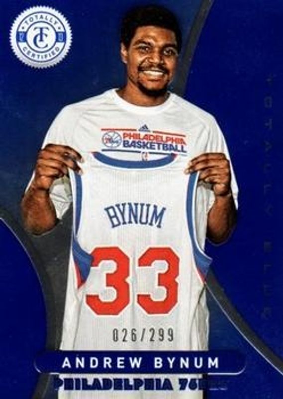 The Andrew Bynum 2012 Totally Certified #36 Totally Blue /299 card is 1 of 25 Andrew Bynum's card variations in the 2012 Totally Certified set being tracked by Sports Card Investor, including Base, Totally Red /499, Totally Gold /25, Totally Green /5, and Printing Plate Black /1.