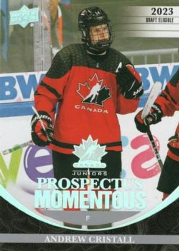 The Andrew Cristall 2023 Upper Deck Team Canada Juniors #PM-11 Prospectus Momentous card is 1 of 84 Andrew Cristall's card variations in the 2023 Upper Deck Team Canada Juniors set being tracked by Sports Card Investor, including #148 Base, #89 Base, #24 Base, #101 Base, and #24 Clear Cut.