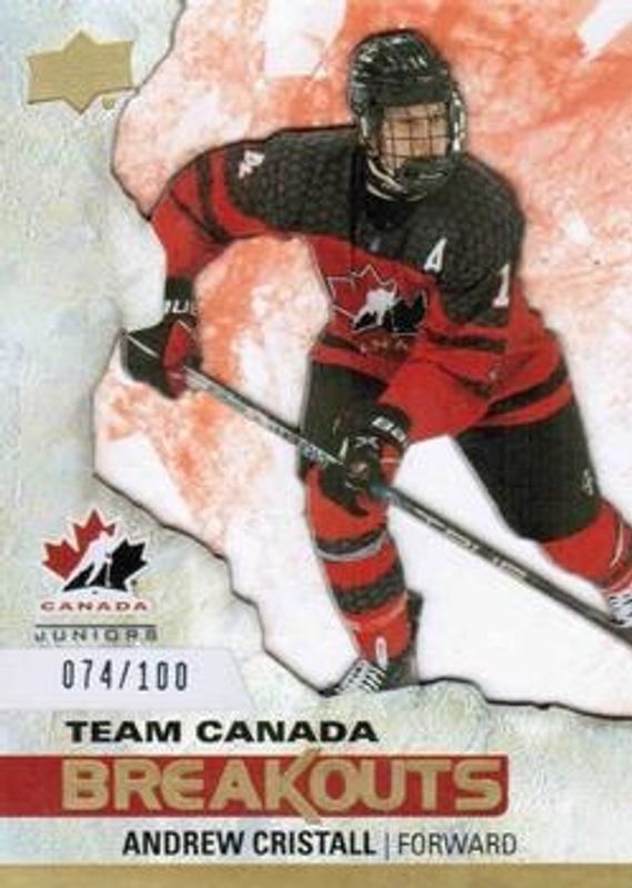The Andrew Cristall 2023 Upper Deck Team Canada Juniors #TCB-4 Team Canada Breakouts /100 card is 1 of 84 Andrew Cristall's card variations in the 2023 Upper Deck Team Canada Juniors set being tracked by Sports Card Investor, including #148 Base, #89 Base, #24 Base, #101 Base, and #24 Clear Cut.