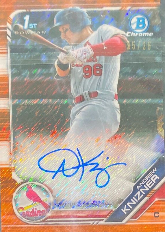 The Andrew Knizner 2019 Bowman #CPA-AK Chrome Prospect Auto - Orange Shimmer Refractor /25 (1st) Rookie card in Raw condition has not changed in price in the last 30 days and was last sold for $50.00 .