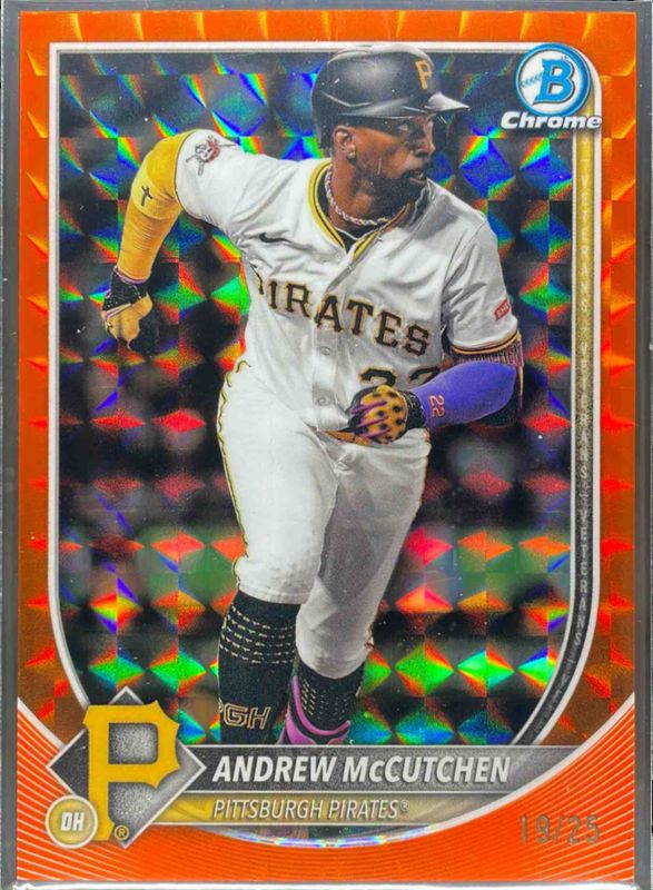 The Andrew McCutchen 2025 Bowman Chrome #24 Orange Geometric Refractor /25 card is 1 of 27 Andrew McCutchen's card variations in the 2025 Bowman Chrome set being tracked by Sports Card Investor, including Base, Geometric Refractor /499, Refractor /499, Pulsar Refractor /399, and Fuchsia Refractor /299.
