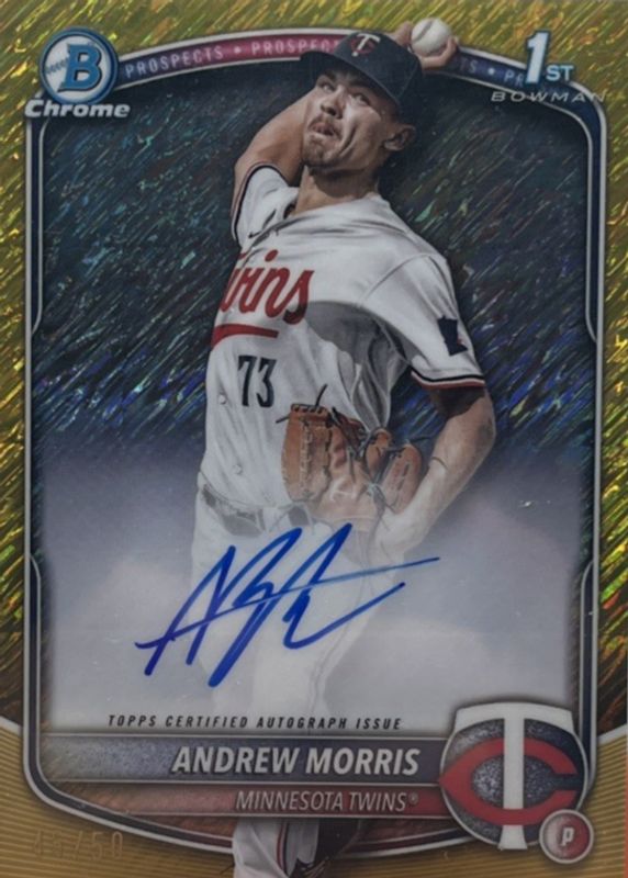 Auctions Ending Soon for Andrew Morris 2025 Bowman #CPA-AMO Chrome Prospect Auto - Gold Shimmer Refractor /50 (1st) RAW