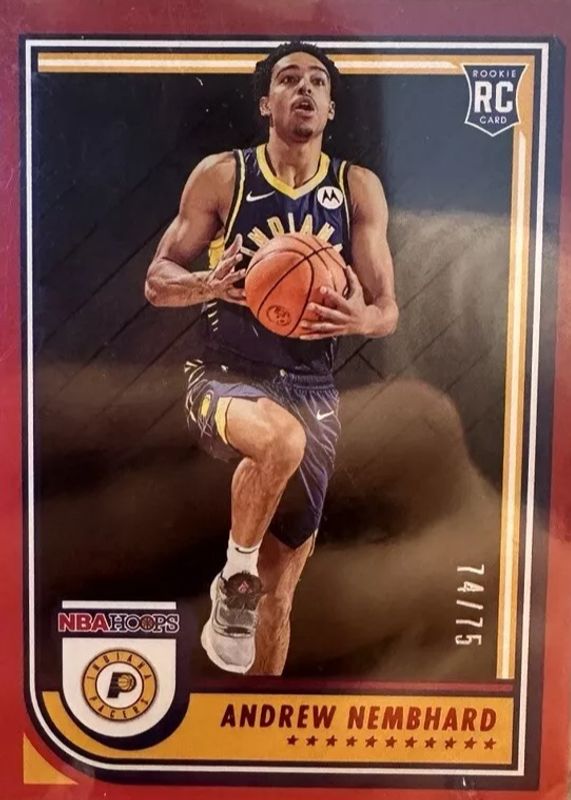 The Andrew Nembhard 2022 Hoops #259 Red /75 Rookie card in Raw condition has not changed in price in the last 30 days and was last sold for $2.29 .