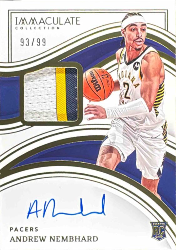 The Andrew Nembhard 2022 Immaculate #122 Base /99 Rookie card is 1 of 28 Andrew Nembhard's card variations in the 2022 Immaculate set being tracked by Sports Card Investor, including Red /49, Gold /10, Premium Patch Autographs, Premium Patch Autographs - FOTL, and Premium Patch Autographs - Gold.