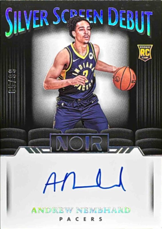 The Andrew Nembhard 2022 Noir #SSD-ANE Silver Screen Debut Signatures /99 Rookie card is 1 of 49 Andrew Nembhard's card variations in the 2022 Noir set being tracked by Sports Card Investor, including #169 Association Edition /99, #367 Base /99, #327 Base /99, #199 Base /99, and #199 Icon Edition /99.
