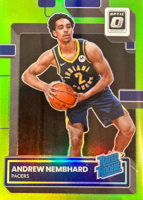 The Andrew Nembhard 2022 Optic #230 Lime Green /149 Rookie card in Raw condition has not changed in price in the last 30 days and was last sold for $4.00 .