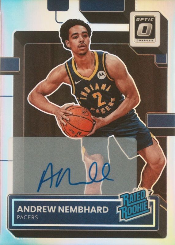 The Andrew Nembhard 2022 Optic #230 Rated Rookie Signatures - Holo card in Raw condition has not changed in price in the last 30 days and was last sold for $42.52 .