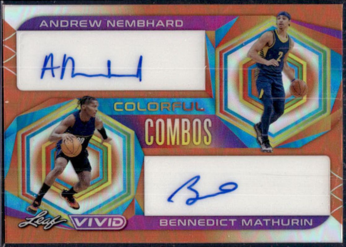 The Andrew Nembhard / Bennedict Mathurin 2022 Leaf Vivid #CC-3 Colorful Combos Dual Autographs - Orange /10 card is 1 of 11 Andrew Nembhard / Bennedict Mathurin's card variations in the 2022 Leaf Vivid set being tracked by Sports Card Investor, including Colorful Combos Dual Autographs Pre Production Proof Black Prismatic /1, Colorful Combos Dual Autographs - Black, Colorful Combos Dual Autographs - White, Colorful Combos Dual Autographs - Green /15, and Colorful Combos Dual Autographs - Purple /5.