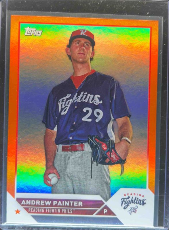 The Andrew Painter 2023 Topps Pro Debut #PD-110 Orange /25 card is 1 of 24 Andrew Painter's card variations in the 2023 Topps Pro Debut set being tracked by Sports Card Investor, including Base, Fuchsia /199, Sparkle /175, Blue /150, and Green /99.