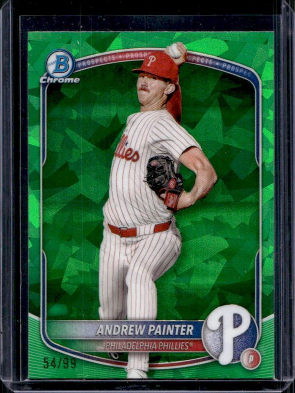 The Andrew Painter 2025 Bowman Sapphire Edition #BCP-116 Chrome Prospects - Green Refractor /99 card is 1 of 9 Andrew Painter's card variations in the 2025 Bowman Sapphire Edition set being tracked by Sports Card Investor, including Chrome Prospects, Chrome Prospects - Yellow Refractor /75, Chrome Prospects - Gold Refractor /50, Chrome Prospects - Orange Refractor /25, and Chrome Prospects - Black Refractor /10.