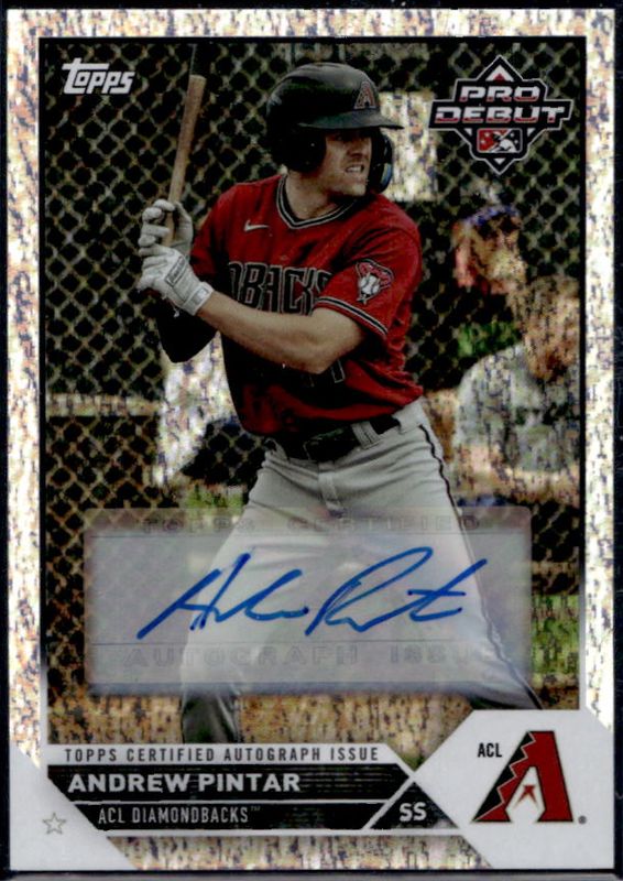The Andrew Pintar 2023 Topps Pro Debut #PD-75 Autographs - Sparkle /199 card is 1 of 28 Andrew Pintar's card variations in the 2023 Topps Pro Debut set being tracked by Sports Card Investor, including Base, Fuchsia /199, Sparkle /175, Blue /150, and Green /99.