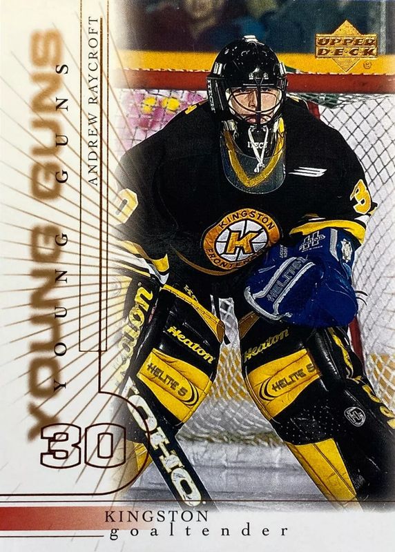 The Andrew Raycroft 2000 Upper Deck #206 Young Guns Base Rookie card in Raw condition has moved up $8.71 (+87.1%) in the last 30 days and was last sold for $18.71 .