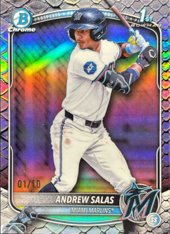 This card is 1 of 102 Andrew Salas' card variations in the 2025 Bowman Chrome set being tracked by Sports Card Investor, including Base Image Variation, International Refractor Variation, Melt Mashers, Prospect Auto (1st), and Prospect Auto - Black & White Shimmer Refractor (1st).