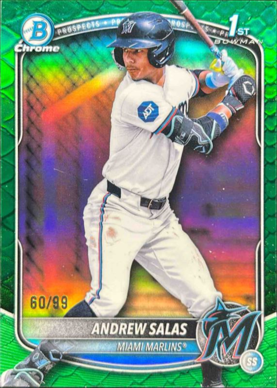 This card is 1 of 102 Andrew Salas' card variations in the 2025 Bowman Chrome set being tracked by Sports Card Investor, including Base Image Variation, International Refractor Variation, Melt Mashers, Prospect Auto (1st), and Prospect Auto - Black & White Shimmer Refractor (1st).